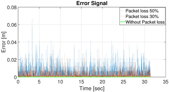 In [33], a networked predictive controller and two algorithms are developed to cope with consecutive packet loss and communication delay for non-linear wheeled mobile robots. The authors simulated the effect of packet loss by considering a tunnel the robot travels through that is no longer detectable with cameras and associated servers [33]. A well-quantified analysis of packet loss and its effects is missing.