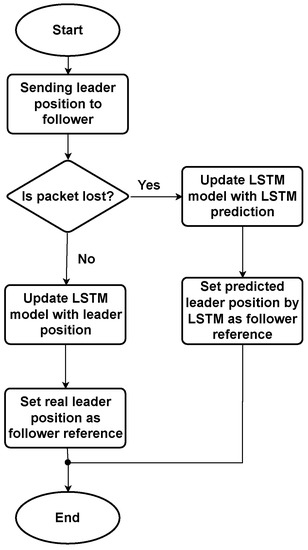 As shown in Figure 5, when no packets are lost, network states are updated with the actual observed leader position. In the event of packet loss, network states are updated using previous LSTM predictions, as observed leader position values are unavailable.
