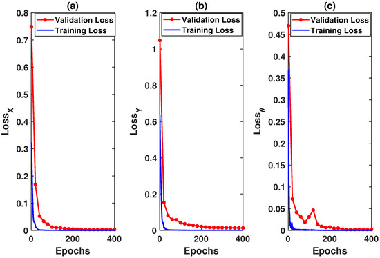 Here, we discuss the prediction performance of LSTM, GRU, and MCP for a circular trajectory for and packet loss. LSTM was trained with the leader’s trajectory positions; 80% of these data were used for training the LSTM and 20% was used for validation. Figure 6 shows the validation and training loss for LSTM. Over the 400 time periods, the proposed LSTM model was able to learn to predict with the desired accuracy.