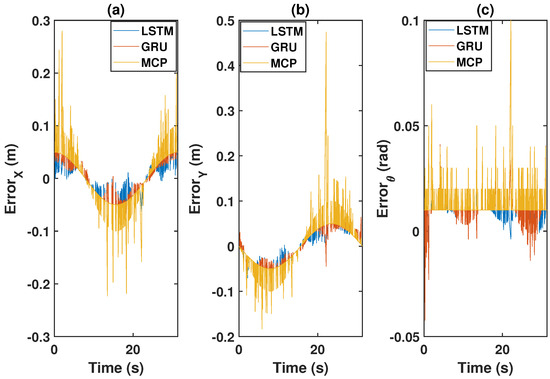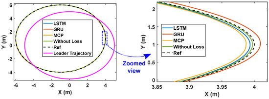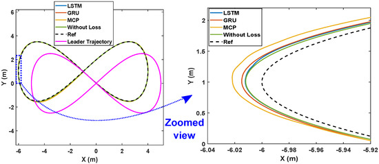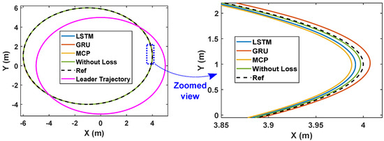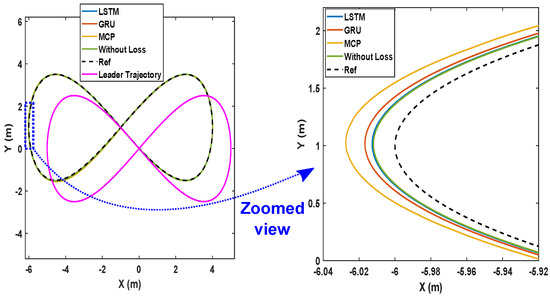 As demonstrated in [52], the LQR controller performs admirably in tracking the trajectory of a single robot along a variety of paths. Here, we extend the LQR tracking control problem [52] to the formation control of multiple robots in various packet loss scenarios. In the leader–follower approach, the leader’s position is communicated to all followers at regular intervals. The communication interval is considered to be 0.05 s and the sampling interval is 0.005 s. The effects of packet loss are depicted in Figure 3, which illustrates how packet loss results in an increased follower position error of around 4 cm. The simulation results in Figure 3 were obtained by considering a memory element in each follower robot that stores the most recent position of the leader. That is, whenever packet loss occurs, a follower makes use of the last received data stored in its memory to track the reference (leader) trajectory. This approach is called MCP, as detailed in Section 2. Here, we apply an LSTM prediction model to alleviate the impact of packet loss and we compare the system’s performance with MCP and GRU.