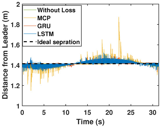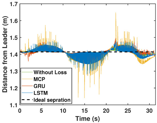 Here, we detail the formation control performance of the leader and the followers while following an eight-shaped trajectory in different packet loss scenarios. Figure 12 shows the system’s performance while the packet loss was 30%. It is clearly visible that the LSTM prediction was very close to the perfect communication scenarios when compared with GRU and MCP. The distance from the leader is depicted in Figure 13. Table 4 gives the RMSE for the X, Y, and heading angle of the followers. LSTM performance (RMSE of X, Y, and heading angle) while having 30% packet loss was even better than it was in the perfect communication scenarios (0% packet loss). This demonstrates that LSTM prediction can completely compensate for packet loss and even compensate for the quantization error in the leader positions due to discrete communication intervals. Overall, LSTM performed 5.20% better than GRU and 156.14% better than MCP.
