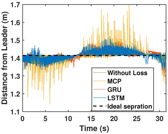 The formation control experiment along the eight-shaped trajectory was repeated with 50% packet loss. As illustrated in Figure 14, LSTM again outperformed GRU and MCP in terms of prediction. The distance from the leader is depicted in Figure 15. MCP had a weaker performance compared to LSTM and GRU. The RMSE for the X, Y, and heading angle of the follower is presented in Table 4 for the 50% packet loss scenario. As observed earlier, LSTM outperformed GRU and MCP. LSTM’s prediction performance is comparable with that in a perfect communication scenario (0% packet loss) even when sustaining 50% packet loss. Overall, LSTM performed 14.49% better than GRU and 250.53% better than MCP.