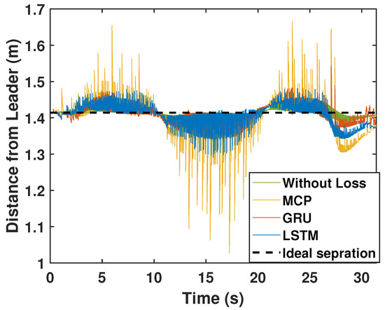 We repeated the circular trajectory scenario with a 50% packet loss. The follower performance is illustrated in Figure 10. LSTM again outperformed GRU and MCP in terms of prediction. The distance from the leader is depicted in Figure 11 and the MCP’s performance is compared to those of LSTM and GRU. RMSE was calculated for the X and Y positions and the heading angle of the follower in Table 3 for a 50% packet loss. Here, LSTM outperformed GRU and MCP; while packet loss was 50%, LSTM performance was only slightly worse than it was with 0% loss. Overall, LSTM performed 21.41% better than GRU and 223.17% better than MCP.