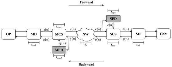 The model adopted in this work considers that several algorithms constitute the computational systems, and each of them increases the system’s latency. Thus, the prediction process should be implemented in parallel to the other algorithms embedded in the MCS and SCS. This consideration aims to decouple prediction techniques from other algorithms, simplify the analysis, and to improve performance. Figure 1 presents a model that uses prediction methods in parallel with computational systems. The prediction modules, identified as MPD and SPD, have the same signal inputs as their respective computational systems, signals and . In this project, the predictions performed use Cartesian values. The module MPD predicts a vector called upon receiving the input vector. This prediction has a processing time of . Similarly, the module predicts the vector on the slave side, with a prediction processing time of .