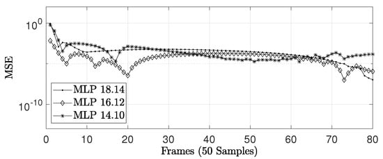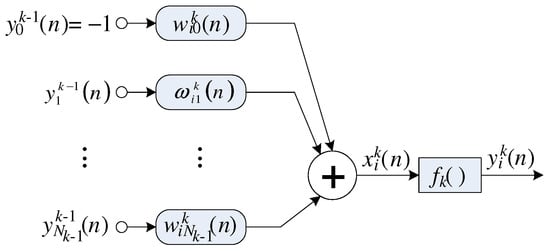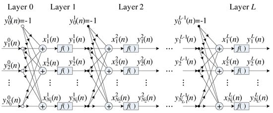 Equation (5) presents a generic MLP with L layers, where each k-th layer can have neurons with inputs representing the number of neurons in the previous layer. The neurons from the k-th layer process their respective input and output signals through an activation function . At the n-th sample, this function is given by