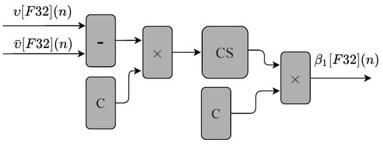 To perform Equation (2), we use one multiplier and one subtractor, as shown in Figure 6. The circuit has three inputs values (, , and ), and one output value (). The and inputs are the mean value of and , respectively.