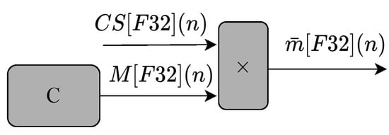 The circuit shown in Figure 5 executes Equation (1). As can be observed, the circuit is composed of one multiplier and one adder. There are three input values, (, , and ), and one output, ().