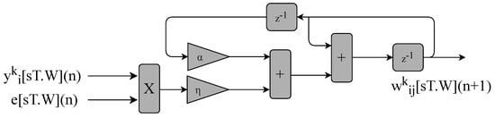 The BPM defines the error gradient and updates the neurons’ weights. The error gradient, , described in Equations (8) and (9), is performed by the circuits shown in Figure 14. The signals , and define the gradient.