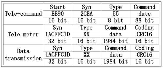 For the requirements of SSS-2A, there are three different data packets in our communication system: telecommand (TC), telemeter (TM) and data transmission (DT). The TC packet contains 128 bits and can be divided into four components. The TM and DT packets contain 2048 bits and can also be divided into four components. The details of the three different packets are shown in