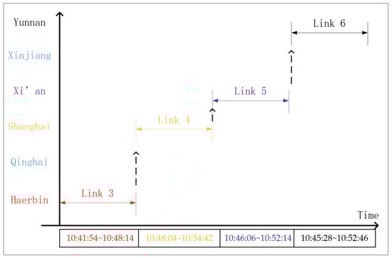 Figure 6, Links 3–6 overlap each other. When selecting the link from Links 3 to 4 and Links 5 to 6 in turn, a virtual continuous link duration from 10:41:54 to 10:54:42 can be established. This virtual link duration lasts 720 s, which is far longer than any single link duration. Similarly, Links 12, 13 and 15 can establish another virtual link duration.