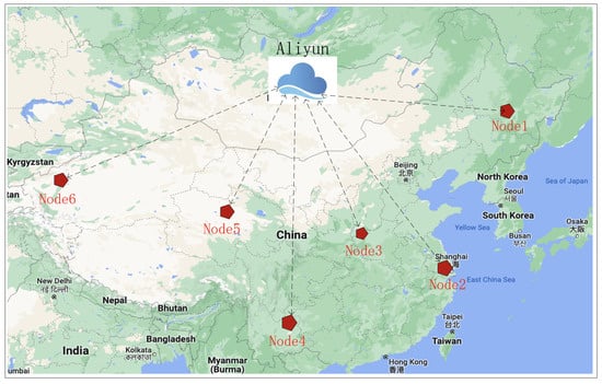 For excellent payload performance, a large amount of data needs to be transmitted from the satellite. To compensate for the short link duration caused by orbit characteristics, multiple ground nodes should be scattered throughout the country. They should be spread evenly across longitudes and latitudes. Based on the actual situation in China, six regional ground stations are selected. They are No. 1, Haerbin (128°4′, 45°3′); No. 2, Shanghai (121°3′, 31°0′); No. 3, Xi’an (108°4′, 33°8′); No. 4, Yunnan (103°4′, 25°3′); No. 5, Qinghai (95°0′, 36°2′); and No. 6, Xinjiang (80°6′, 39°4′), as shown in