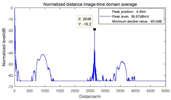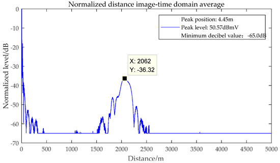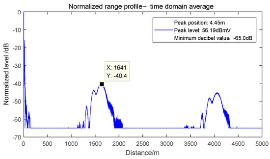 Combining GJB8848-2016 and GJB 151B-2013 [22,23], set the frequency offset of the signal source as , and the one-dimensional range image of the tested radar false alarm signal is shown in Figure 2. According to Equations (10) and (14), the waveform of false alarm signal is broadened due to the existence of secondary phase.