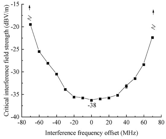 Firstly, combined with the definition of false alarm signal in the early stage, it can be known that the absolute level of false alarm signal is higher than , which is regarded as the effective false alarm level, the electromagnetic sensitivity threshold test has been conducted on the test equipment in the previous period, and the result is shown in Figure 3, which shows that the equipment sensitivity bandwidth is about plus or minus 75 MHz [8]. Therefore, exploring the position of the false alarm signal of the tested radar, set the interference frequency offsets as Δf0 = 0 MHz, Δf1 = −60 MHz, Δf2 = 60 MHz, Δf3 = −75 MHz, Δf4 = 75 MHz corresponding to the position of the false alarm signal as R0, R1, R2, R3, R4, respectively, as shown in Table 2.