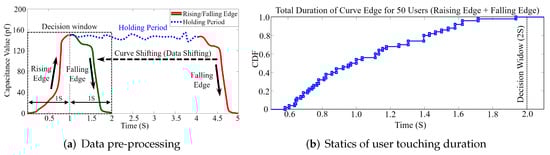 - Step 1: Combined user feature collection. In the first step, BioTouch transparently collects both the bio-capacitance and touching behavior features from the user as they freely operate the device. The feature collection progress is transparent, and both the features are simultaneously collected via the sensor without attracting the user’s attention. The details are presented in Section 4.
