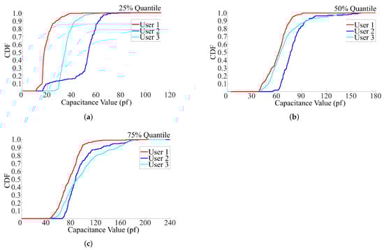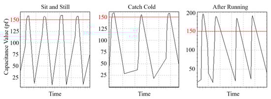 - User body condition. We consider that if a user becomes ill or after strenuous exercise, their behavior might be affected by body conditions, which affects the accuracy of re-authentication. Indeed, such changes might vary from person to person, which is hard to predict. The sensed bio-capacitances of a user under different body conditions are shown in Figure 16. We could tell that the user’s characteristics change in different states. Therefore, the limitation of BioTouch is that it cannot cover those special application scenarios.