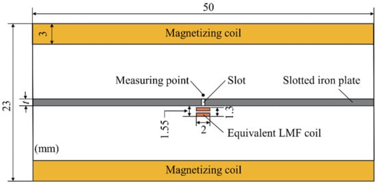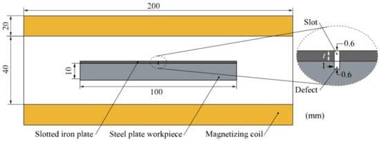 This model is composed of a steel plate workpiece, a slotted iron plate, and a magnetizing coil. The magnetizing coil produces a horizontal magnetization field in the slotted iron plate and the workpiece. There was a groove defect on the steel plate workpiece. The slotted iron plate lift-off layer was located on the steel plate workpiece. The scanning path of LMF was 0.3 mm above the lift-off layer. The relevant dimensions are shown in Figure 11 and the specific parameters are shown in Table 2. Other technical information about the simulation model is consistent with Section 2.2.