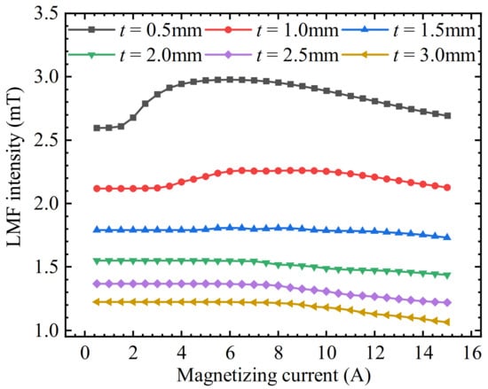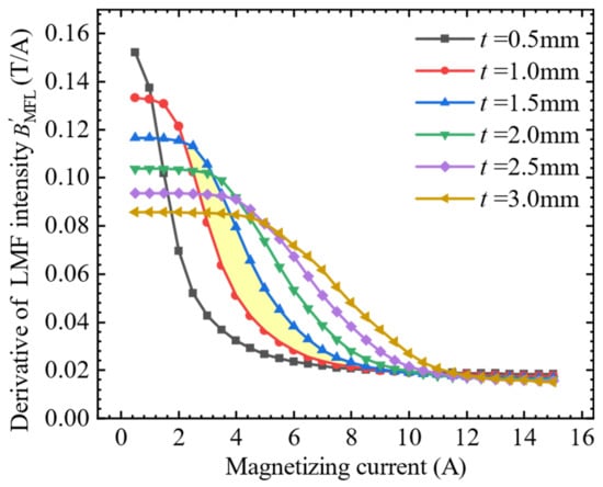 It can be seen that each curve drops quite slowly at first, then falls rapidly, and finally tends to be flat. The relationship between the derivative of LMF intensity and the thickness of SFLL is observed. Taking t = 1.0 mm and t = 1.5 mm as examples, the derivative of LMF begins to decrease rapidly when the magnetizing current exceeds the initial gentle decline stage in the curve of t = 1.5 mm, but the value of the t = 1.5 mm curve is still greater than that of the t = 1.0 mm curve under the same magnetizing current, as shown in the yellow area in Figure 9. This shows that when the magnetization exceeds the stage where the LMF increases linearly with the magnetization, as the thickness of the SFLL increases, the magnetization enhancement effect will increase accordingly.