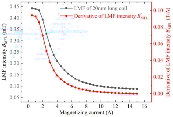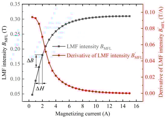 The defect LMF BMFL is the difference between the measuring point magnetic field when the equivalent LMF coil is energized Bon and powered off Boff. The magnetic field of the equivalent LMF coil enhances the local magnetization of the slotted iron plate. The magnetization near the slot is enhanced by a certain ΔH, and the corresponding LMF of the slot is enhanced by ΔB. Then the change of the LMF of the slot under different magnetizations was simulated as shown by the black line in Figure 5. The increasing value of the LMF ΔB gradually decreases with the increase of the magnetizing current. This characteristic quantity can be represented by the derivative of the LMF intensity with respect to the magnetizing current as shown by the red line in Figure 5. The derivative of the LMF intensity decays rapidly with the increase of the magnetizing current at first, and then slowly decays to 0, which explains the decay trend in the latter part of the curves in Figure 4. The increase of the LMF in the SFLL-MFL method due to the magnetization enhancement of the slot is called the magnetization enhancement effect in this paper.