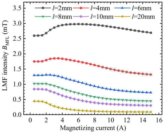 To verify the permeability perturbation effect, the length of the equivalent LMF coil was gradually increased based on the simulation model shown in Figure 3. Lengthening the equivalent LMF coil will make the permeability perturbation area of the iron plate away from the vicinity of the slot. The magnetic field near the defect became gradually uniform, thereby eliminating the influence of the permeability perturbation effect. The lengths of the equivalent LMF coils were 2 mm, 4 mm, 6 mm, 8 mm, 10 mm, and 20 mm, respectively. The simulation results are shown in Figure 6. The results show that as the length of the equivalent LMF coil increases, the variation trend of the equivalent defect LMF with the magnetizing current gradually changes from increasing first and then decreasing to decreasing all the time, which is consistent with the variation trend of the derivative of LMF intensity in Figure 5.