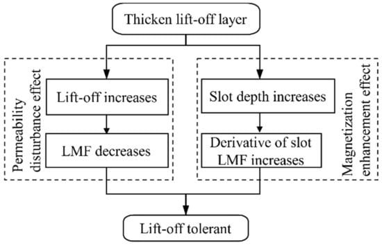 Based on the principle of the SFLL-MFL method, when the thickness of the lift-off layer increases from t1 to t2, the lift-off value of the sensor increases, as shown in Figure 8. The LMF generated by the permeability perturbation effect will decay rapidly with the increase of the thickness like the detection of internal defects in the conventional MFL method [].