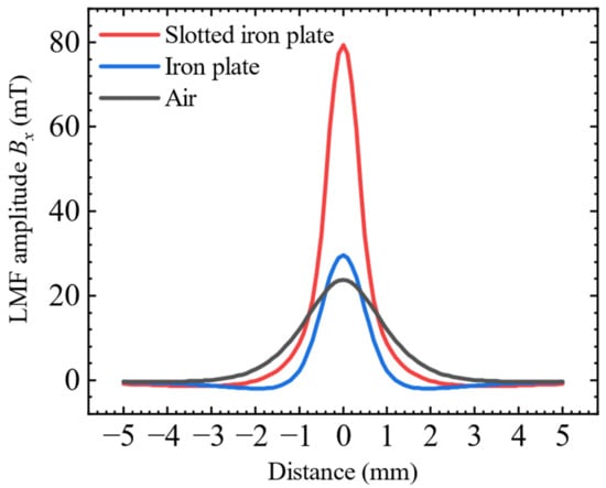 First, the detection effect of the three different kinds of lift-off layers of slotted iron plate, iron plate, and air on the LMF was verified. The LMF distributions of the defect were simulated under three conditions, respectively. Magnetic induction intensity in the horizontal direction Bx was extracted along the scanning path, and the background magnetic fields of the corresponding three models without defects were subtracted to obtain the distribution of the defect LMF, which is plotted in Figure 12. It can be seen that the LMF intensity of the slotted iron plate lift-off layer was 79 mT, the iron plate lift-off layer was 30 mT, and the air was 24 mT. The simulation results verified that the iron plate lift-off layer has a certain enhancement effect relative to the air lift-off layer, but is not prominent. When compared with the air lift-off layer, the LMF amplitude Bx with the slotted iron plate lift-off layer was enhanced by 263%. The enhancement effect of the SFLL is remarkable.