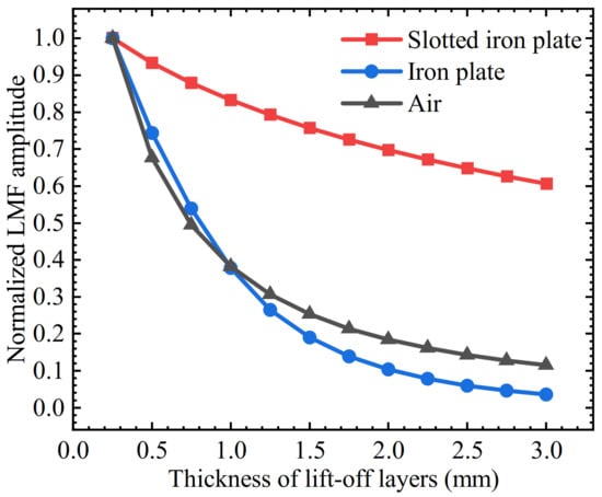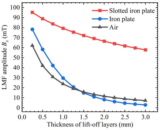 The thickness of the lift-off layer t varied from 0.25 mm to 3 mm with an interval of 0.25 mm. The amplitudes of the LMF Bx were plotted in Figure 13. It can be seen that the Bx of the LMF of the three kinds of lift-off layers are all attenuated with the increase of the lift-off layer thickness. However, compared with the air lift-off layer, the iron plate lift-off layer only enhances the LMF when t is less than 1.5 mm. When t is greater than 1.5 mm, the LMF is weakened instead of enhanced. The Bx of the slotted iron plate lift-off layer is stronger than that of the iron plate lift-off layer and the air lift-off layer at different t.