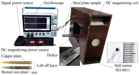 In order to verify the feasibility of the SFLL-MFL method, an experimental platform was built as shown in Figure 15. The experimental sample was a Q235 steel plate with a length of 300 mm, a width of 40 mm, and a thickness of 10 mm. An artificial defect of the transverse rectangular groove was processed by electrical discharge machining on the upper surface of the steel plate sample. The groove defect length was 40 mm, the width was 0.6 mm, and the depth was 1 mm. The DC magnetizing coil with 3000 turns was powered by a DC magnetizing power source. The steel plate sample was longitudinally magnetized with a magnetizing current of 10 A. The Hall element HG-0811 was adopted as the magnetic sensor, and the signal was collected and displayed by the oscilloscope directly. To ensure the accuracy of the slotted iron plate and copper plate lift-off layer thickness, feeler gauges were used as the lift-off layer for the experiments. The thickness of the two kinds of lift-off layers was set to 1.5 mm. The slot on the iron plate was processed by wire cutting, and the slot width was 0.6 mm.