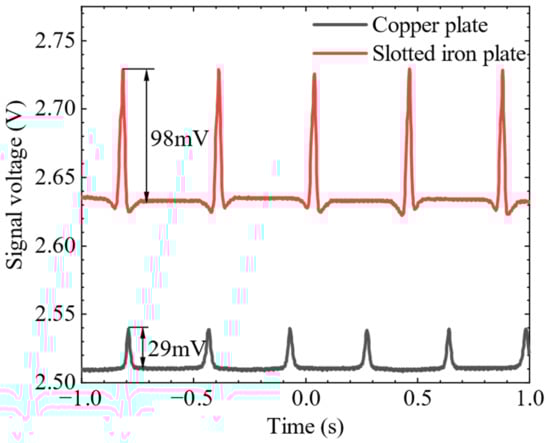 The Hall element was fixed on the slotted iron plate and aligned with the centerline of the slot. The slotted iron plate, which was close to the steel plate sample, scanned the defect on the steel plate sample several times. Stable MFL signal waveforms were obtained on the oscilloscope. Then the Hall element was fixed on the copper plate and scanned the defects in the same way. The signal waveforms of the copper plate were obtained on the oscilloscope. The experimental results are shown in Figure 16. It can be seen that the signal amplitude of the copper plate lift-off layer is 29 mV, while the signal amplitude of the slotted iron plate lift-off layer is 98 mV, which is about 3.4 times that of the copper plate lift-off layer. The enhancement effect of the MFL signal in the SFLL-MFL method is obvious.
