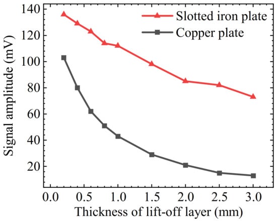 Then, the effect of the slotted iron plate and the copper plate on the intensity of the LMF was verified under different lift-off layer thicknesses. For verification, 0.2 mm, 0.4 mm, 0.6 mm, 0.8 mm, 1.0 mm, 1.5 mm, 2.0 mm, 2.5 mm, and 3.0 mm thick copper plate lift-off layers and slot iron plate lift-off layers were used. The amplitudes of the MFL signals under the above-mentioned experimental conditions are obtained, respectively. The average value was obtained by scanning multiple times, as plotted in Figure 17.