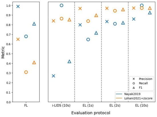 Table A1 and Table A2 show the results of the two methods on view 1 and view 2 of the i-LIDS test dataset through different evaluation protocols. These results are a tabular representation of Figure 9 and Figure 14, respectively. The columns FL, i-LIDS, EL (1 s) and so on represent different evaluation protocols, whereas P, R and denote precision, recall and scores.