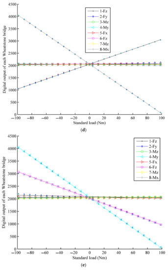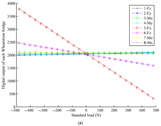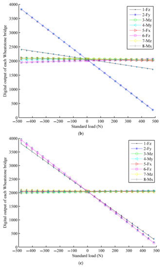 The sensor coupling errors obtained are shown in Table 2. It can be seen from Table 2 that the maximum coupling error in the Fx is −1.81%; the maximum coupling error in the Fy is −1.15%; the maximum coupling error in the Fz is 0.54%; the maximum coupling error in the Mx is −0.78%; the maximum coupling error in the My is 0.59% and the maximum coupling error in the Mz is 1.24%.