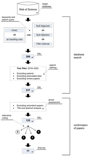First, we define the systematic literature review (SLR) methodology used in our study. The process of selecting recent high-quality research papers targeting the HVAC FDD methods is illustrated by a workflow shown in Figure 1. The corresponding procedure involves two main parts: (1) a database search, which includes the definition of keywords, key phrases, and search query, as well as the refinement (i.e., filtering) of the initial result set, and (2) a confirmation process, in which the remaining papers are analyzed in more detail and subjected to relevance voting. In the following text, the individual steps of this workflow are explained.