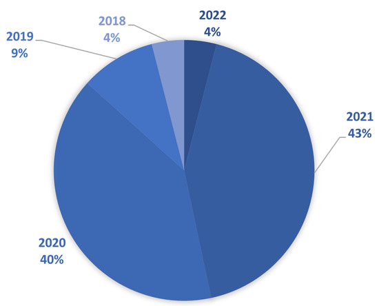 The basic statistical data of the finally selected literature are presented in Figure 2, Figure 3 and Figure 4. Figure 2 shows a graphical interpretation of the entire dataset, filtered by year of publication. It can be seen that most of the selected papers were published in 2021 (43%) and 2020 (40%).