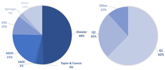 Figure 3 (left) shows the sources of the selected research literature. In terms of journal publishers, most of the selected articles come from Elsevier (49%), followed by MDPI (21%), IEEE (10%), Taylor & Francis (4%), Springer (3%), and SAGE (1%). Other sources (12%), include titles from conference proceedings published by IEEE, IBPSA (International Building Performance Simulation Association) and E3S Web of Conferences. In the same figure, on the right, we can see that the target work is of high quality. Namely, most of the selected papers are from journals belonging to quartile Q1 (62%), followed by quartile Q2 (26%) and the Other category (12%), which includes conference papers with undefined ranks.