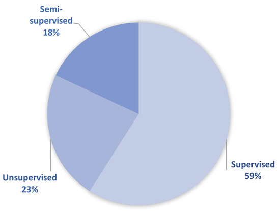 Figure 7 shows an overview of the mentioned learning types among the selected papers that tackle both the data-driven and hybrid approach. It can be seen that supervised learning is by far the most commonly used by researchers and developers, although annotated datasets are not easy to obtain.