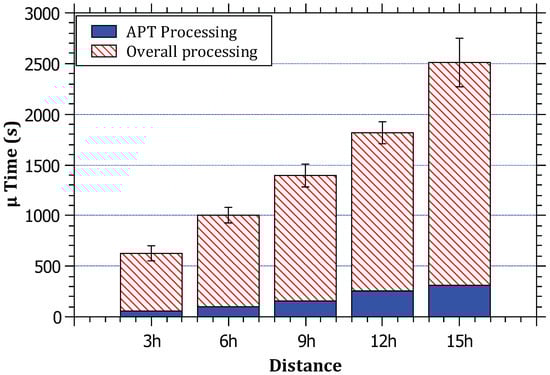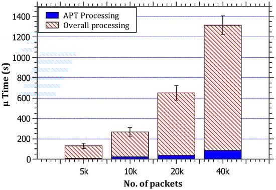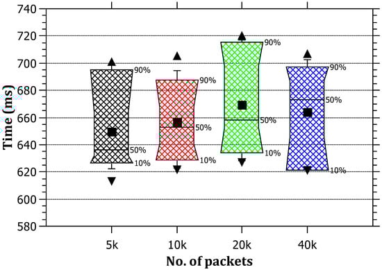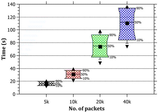 In Figure 7, it can be noticed that the ratio of the average processing time taken by the RAPT algorithm to the total simulation processing time does not exceed 9% in its most extreme cases, which are acceptable rates, although not optimal. The results also reveal that, with the increase in the traffic, the overall processing time increases in a linear correlation. The reasoning for this is that the simulation time = processing time + packet routing time. The reason for the linear increase in simulation time can be attributed to the packet routing time, and this is normal because every packet needs routing at every router on the path; therefore, it can be concluded that the processing burden does not constitute a large proportion of the path simulation time.