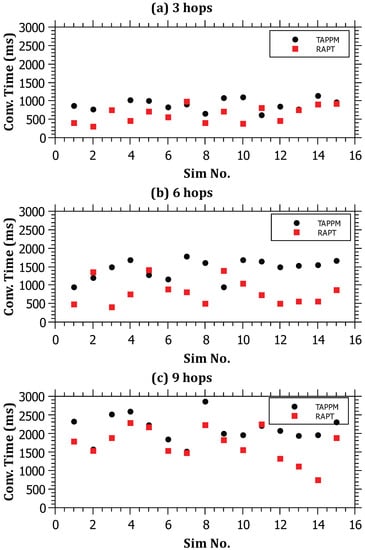 Figure 11. The relationship between the distance of the attack and the convergence time for (a) 3 hops; (b) 6 hops; and (c) 9 hops. - Robustness: This metric is used to measure the resilience and scalability of the algorithm against large-scale DDoS attacks. The robustness of RAPT and TAPPM was evaluated in terms of scalability by increasing the number of attackers, that is, when the number of attackers exceeds 15 attackers. Both of the algorithms were evaluated by varying the number of attackers between 5 and 30 running the simulator 15 times for each algorithm and number of attackers. The amount of traffic generated from each attacker is fixed to 5000 packets. The obtained results as depicted in Figure 12 show that, when the number of attackers is less than 15, the average trace time per attack path is better for the TAPPM. This can be due to the fact that, when the number of attackers is low, the attack paths will definitely be low; therefore, less generated attack packets need to be injected in the attack path, which yields a small number of hit routers being collaborative. However, as the number of attackers increases, the average tracing time for the RAPT algorithm significantly performs better. The reason behind this is that the RAPT algorithm is resilient against multi-source/multi-path attacks, thanks to the use of a single tracing packet per path yielding parallel trace packets reaching the victim from multiple sources. Each path is tracked separately without relying on other paths, whereas in the TAPPM algorithm, when the number of attackers increases, the need for a larger number of packets to be marked will increase significantly causing the dramatic increase in average tracing time.