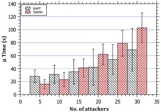 - Convergence Time: This is the time elapsed since the start of attack packets being generated from the attacker(s) until the building of the attack path. The performance of RAPT was compared with TAPPM by running the simulations 15 times over multiple distances, namely, 3, 6, and 9 hops. The results in Figure 11 show that the convergence time is proportional to the distance for both algorithms. This is predictable as the routers on the path need to perform computations and communications for both algorithms; however, RAPT outperforms TAPPM since the attack path will require only one packet to travel between the attacker and the victim. The TAPPM algorithm requires more time and packets from the attacker to realize the attack and select the hit routers, which will mark a significant amount of packets that will be received by the victim to rebuild the attack path.