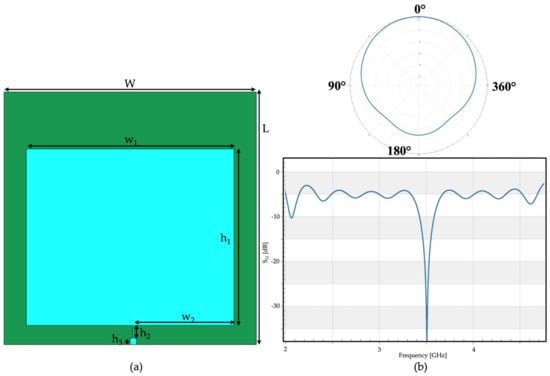 First wearable patch antenna simulated, tuned to f = 3.5 GHz: (a) geometry of the antenna, front view; (b) performances of the antenna in terms of, in the upper part, radiation pattern (φ = 0°), and, in the lower part, the reflection coefficient (S11).