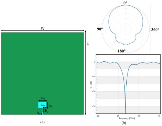 First wearable patch antenna simulated, tuned to f = 26.5 GHz: (a) geometry of the antenna: front view; (b) performances of the antenna in terms of, in the upper part, radiation pattern (φ = 0°) and, in the lower part, the reflection coefficient (S11).