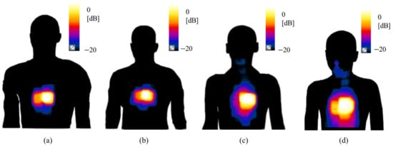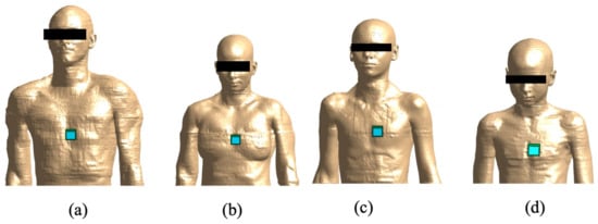 For all human models, the antennas were positioned at the same position: on the trunk, centered on the heart of each model (Figure 4). The distance between the antenna and the human model was set equal to 2 mm to simulate a scenario of common use of a wearable device in an off-body configuration that was as realistic as possible. The antenna was positioned with the ground plane facing the human model [24].