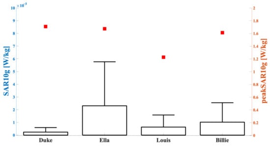 For better characterizing the exposure levels, Figure 6 reports the peak value and boxplot of the SAR10g distributions for all human models. As shown in the figure, slightly higher peak SAR10g values were obtained for the adult models compared with the adolescents. Moreover, the figure clearly shows that for each human model there was a large gap between the peak SAR10g and the 75th percentile of the distribution. It was, therefore, reasonable to assume that the large part of the data of the SAR10g distributions were well below their peak values.