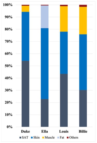 Furthermore, we also studied the distributions of SAR10g values among tissues, namely, the identification of the most involved tissues, by quantifying the percentage of tissue where the SAR10g distribution was higher than the threshold. These percentages clearly showed that, in all the studied configurations, the skin and the subcutaneous adipose tissue (SAT) were the most involved tissues in exposure; the greatest involvement of these tissues was due to the fact that they are the most superficial ones (see Figure 7). It is important to underline that these percentages were given in proportion to the volume that each tissue occupied in the cubical box. In addition, muscle was among the tissues mostly involved in exposure for all human models except for Ella; in that case, fat tissue was characterized by higher exposure than the other simulated human model cases. This was probably due to the larger volume that fat occupies in the volume of interest for the adult female model, compared with other human models.