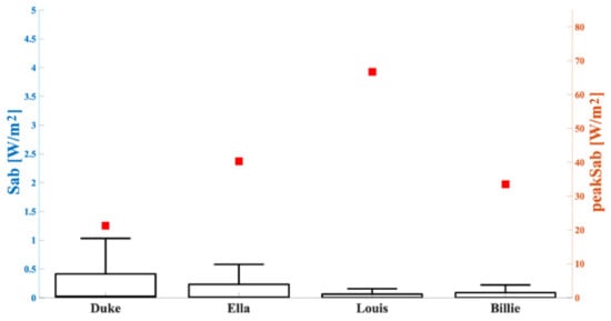 Sab (left y-axis, boxplot) and peak Sab (right y-axis, square symbols) in the tissues included in the cubical box relative to the analyzed simulated human model. The bottom and top edges of the boxes are the 25th and 75th percentiles. The lower whisker extends to the minimum values, while the upper whisker extends to 1.5 times the height of the box.