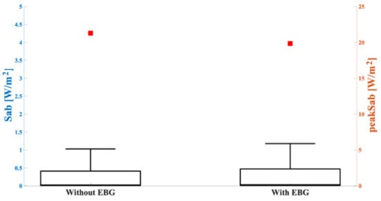 To test if the presence of the EBG was incisive in the human exposure context, we also simulated the antenna at the highest frequency with the EBG and positioned it on the trunk of the Duke model. Then we extracted the Sab values averaged over the skin surface and compared them with the results obtained in the case without the EBG. Figure 9 shows the peak values and the descriptive statistics of the Sab distributions relative to the configurations without, and with, the EBG. Comparing the results obtained in these two cases, it was noteworthy that the most evident difference resided in the peak value of the Sab, because the peak value found in the case with the EBG was about 7% lower than without the EBG, whereas the box plots in the two cases were almost identical.