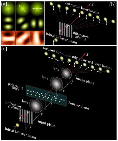 We should note that some polarization transformation and generation of multiple laser beams with different polarization states is possible with diffractive optical elements [8,9,15,16]. This is possible, for example, because of the polarization and phase interaction of non-uniformly polarized laser beams with singular-phase structures [9]. However, there are some limitations, and only several types of polarization transformations are possible. More controllable polarization transformation can be achieved using 4-f optical systems with spatial polarization filtering [17]. In this case, a designed polarizing filter is located in the Fourier plane and transforms the polarization state of the input linearly polarized structured laser beam. As such a polarizing filter, a quarter-wave plate or a half-wave plate can be used to identically change the polarization state at every point of the initial beam. More complex polarization transformation is possible with q-plates/S-waveplates [18,19], which are, in fact, segmented wave plates with spatially variable retardation [20]. Then, if the element with a phase function of a diffractive beam splitter is located in the input plane of the 4-f optical system, we can use such a polarization filter to transform the linear polarization of each multiplexed laser beam into a linear polarization with the desired polarization direction. Such transformed laser beams can be used for locally variant patterning of polarization-sensitive azopolymers films for the fabrication of various elements of diffractive optics and photonics.