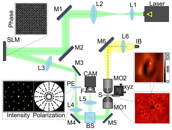 The optical schema of the experimental setup used for the laser patterning of the thin azopolymer films is shown in Figure 2. The setup was based on the reflective spatial light modulator (SLM) HOLOEYE PLUTO VIS (1920×1080 px, pixel size of 8 μm) for the realization of phase masks of the diffractive optical element performing the splitting of the illuminating Gaussian beam into a set of light spots arranged around a circle. A linearly polarized Gaussian beam from a solid-state laser (λ = 532 nm, Pout = 15 mW) was extended and collimated with a combination of two lenses, L1 and L2, with focal lengths of 25 and 150 mm. The collimated laser beam was directed onto the SLM with the help of mirrors M1 and M2. The 4-f optical system, consisting of two lenses, L3 and L4, as well as polarizing element PE, was used for the spatial filtering of the modulated laser beam. For the polarizing element, we used three different elements—a half-wave plate and first- and second-order q-plates. The half-wave plate allowed us to control the orientation of linear polarization of the field; the first- and second-order q-plates were used to generate polarization patterns corresponding to the cylindrical polarization of the first (azimuthal polarization) and second orders. The polarizing element was located in the focal plane of lens L3. Thus, we had the ability to control the polarization distribution of each formed light spot and obtain different polarization patterns. The spatially filtered laser radiation was directed into the input pupil of a micro-objective, MO1 (NA = 0.40), with the help of mirrors M3, M4, and M5. The glass substrate S with a carbazole-containing azopolymer thin film was mounted on the 3-axis XYZ translation stage and located in the focal plane of micro-objective MO1. The thickness of the azopolymer thin films used was 1.5 µm. A system consisting of a light bulb, IB; a spherical lens, L6 (focal length of 50 mm); a mirror, M6; and a micro-objective, MO2 (NA = 0.1), was used to illuminate the surface of the glass substrate. To observe the surface of the glass substrate with the carbazole-containing azopolymer thin film during laser writing, we used a system consisting of a beam splitter, BS; a lens, L5 (focal length of 150 mm); and a video camera, CAM (TOUPCAM UHCCD00800KPA; 1600 × 1200 px with a pixel size of 3.34 μm). A neutral density filter, F, was used to decrease the intensity of the observed laser beam.
