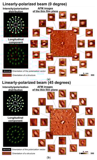 The calculated distributions of the longitudinal components of the structured laser beams used in the experiments were in good agreement with the profiles of the fabricated microstructures, which, once again, confirmed the possibility of using the longitudinal component of light to predict the shape of the microstructures formed in the thin azopolymer films. This also allows one to use azopolymer thin films as detectors of the polarization state of the illuminating laser beam—not only the entire beam as a whole but also its individual sections.