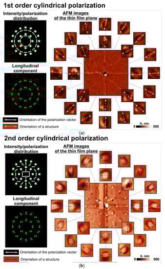 Laser patterning of a thin azopolymer film with a set of modulated polarized spots with non-uniform polarization distributions, which correspond to the first/second order cylindrical polarization. Modeling intensity distributions of the used illuminating laser beams as well as atomic force microscopy (AFM) images of the fabricated microstructures for first-order (azimuthal) cylindrical polarization (a), and second-order cylindrical polarization (b).