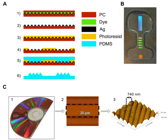 Finally, the whole PDMS layer is removed from the DVD-R and precisely cut to the desired final form-factor using a CO laser (Figure 2B). Full details of this process can be found in Appendix A.